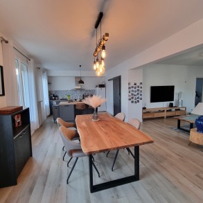 Vaste entrée, séjour double très lumineux, cuisine moderne aménagée et équipée avec Îlot central.